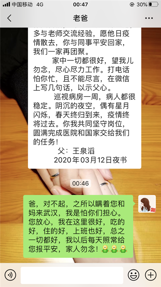 3月21日,周口援鄂醫(yī)療隊(duì)出征滿一月。當(dāng)晚,王泉滔通過微信又鄭重給女兒說下這番話:一晃你在武漢一個(gè)月了,我和家人從你去武漢的擔(dān)心到現(xiàn)在的放心,這是國家給予我們的安心。農(nóng)民把地種好,教師把學(xué)教好,士兵把國門守好,醫(yī)護(hù)把病治好,都是自己的使命,更是自己的初心。人人懷揣私字,社會必?cái)?,遭殃的終歸眾人;眾人心懷天下,萬物皆勝,受益的定是人人??吹胶幽喜糠衷踽t(yī)療隊(duì)從武漢凱旋歸來,雖然沒有你的身影,但是我們很高興,說明武漢的疫情已得到控制,我和家人一起期盼你早日歸來。但是還是要再次叮囑你,不要因?yàn)橐咔榈搅俗詈蠖潘删?,上下班路上注意安全,穿脫防護(hù)服不能有一絲懈怠,時(shí)刻保持警醒。年前你當(dāng)了姑姑,雖然還沒有見到你侄子,但他和家人共同期待你平安回來。吾兒加油!