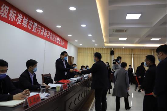 城關(guān)鎮(zhèn)、縣城管局、縣市場監(jiān)管局3家單位主要負責人和縣1家城市保潔公司,圍繞創(chuàng)建國家空氣質(zhì)量二級標準城市工作相繼作表態(tài)發(fā)言。各鄉(xiāng)鎮(zhèn)黨委書記分別向縣委書記王國璽遞交創(chuàng)建保證書。