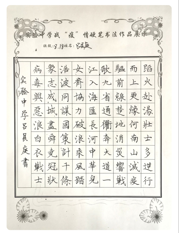 “赴湯蹈火壯士多,逆行而上更緣何。南山滅疫驅(qū)前線,楚地消災(zāi)響戰(zhàn)歌。九省通衢奔大道,一江入海匯長(zhǎng)河。中華兒女齊協(xié)力,破浪乘風(fēng)踏浩波......”扶溝縣實(shí)驗(yàn)中學(xué)“萬眾一心 抗擊新冠”硬筆書法比賽中,八(18)班呂艮庭同學(xué)鄭重地抄錄了這首律詩(shī)。
