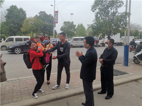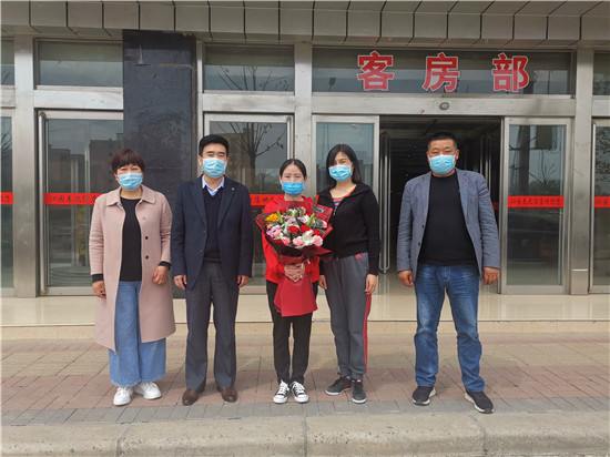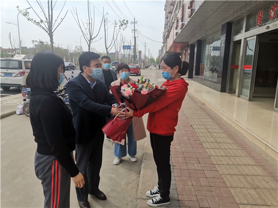 鄲城縣婦幼保健院院長亢國良帶領(lǐng)副院長羅素霞、護(hù)理部主任王翠蘭,到隔離點(diǎn)迎接該院援鄂英雄丁錕回家,為英雄送去鮮花,并全程護(hù)送丁錕安全返回家中。