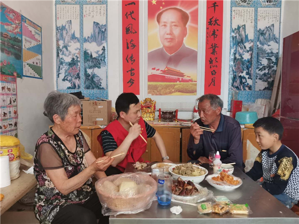 當(dāng)日,付留兵走進(jìn)廚房,拿起鍋鏟,俯下身子,炒起了大盤(pán)雞,經(jīng)過(guò)一個(gè)多小時(shí)忙活,熱騰騰的大盤(pán)雞端上了桌。大家圍坐在一起,邊吃邊聊,氣氛其樂(lè)融融。付留兵在飯桌上敞開(kāi)心扉與貧困戶面對(duì)面交談,再次實(shí)地核對(duì)了貧困戶的基本信息和“兩不愁、三保障”等各項(xiàng)政策落實(shí)情況,進(jìn)一步發(fā)現(xiàn)問(wèn)題、研究問(wèn)題、解決問(wèn)題。飯后,貧困戶龔興超的父親泛著感動(dòng)的淚光,拉著付留兵的手說(shuō):“今天的雞子真香,真的要感謝黨,感謝黨的精準(zhǔn)扶貧政策,讓我們更加堅(jiān)定了戰(zhàn)勝貧困的決心和信心!”