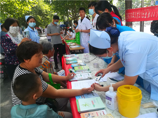 活動(dòng)現(xiàn)場,參加宣傳活動(dòng)的各單位工作人員為市民散發(fā)宣傳相關(guān)資料,并為市民進(jìn)行義診。
