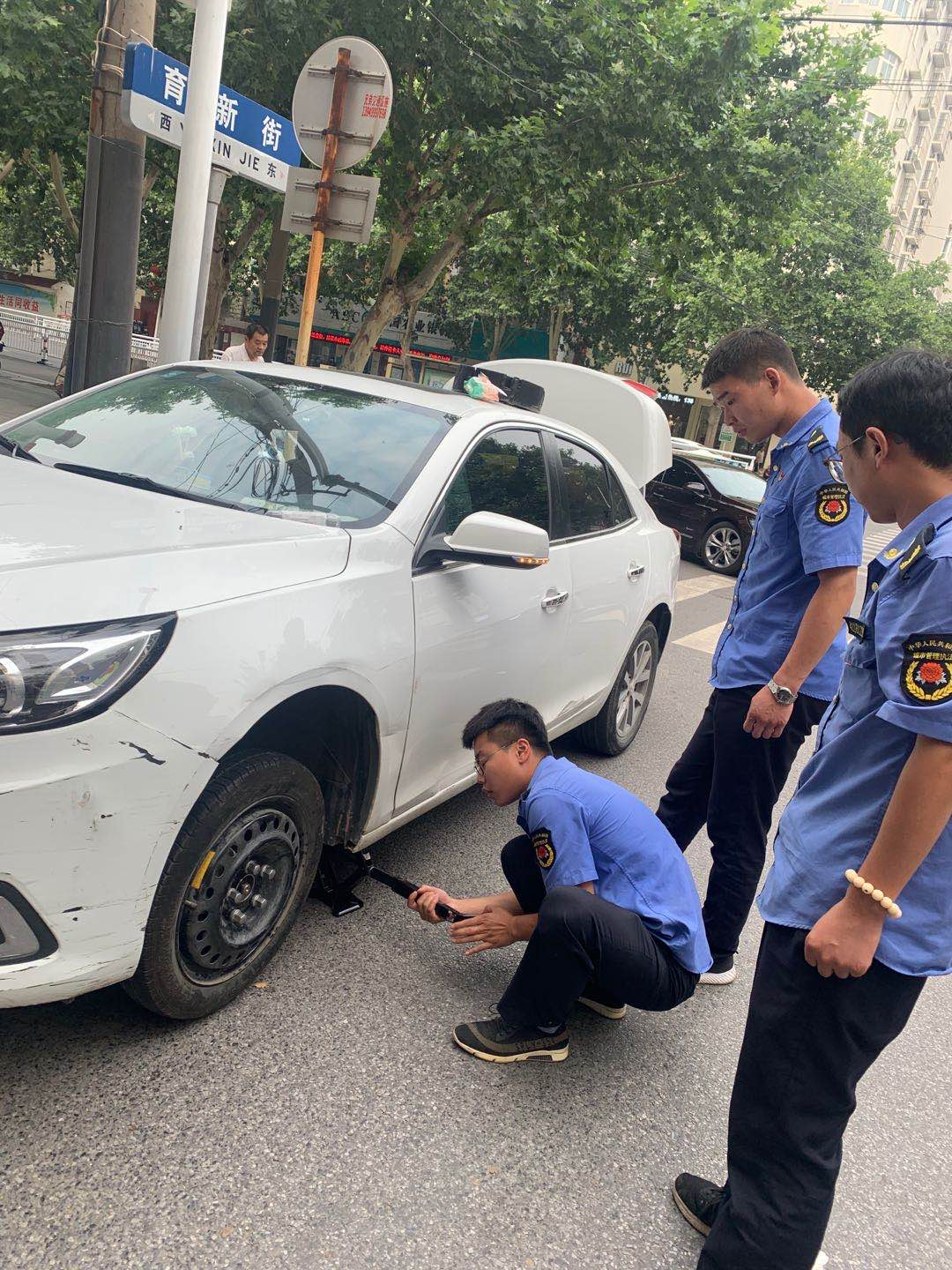 當時,城管隊員上前查看發(fā)現(xiàn),車輛左前輪爆胎,一位女車主正在車邊焦急地徘徊,車內(nèi)還有一兒童,因天氣炎熱,焦躁不安。