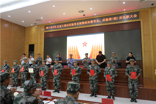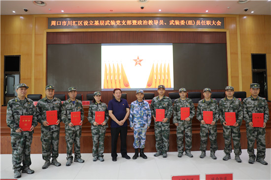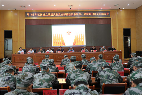 黨管武裝建設國防,軍民攜手共筑長城。為健全武裝工作組織領導體系為推動國防動員和后備力量建設在基層末端落實,7月16日上午,周口市川匯區(qū)召開基層武裝黨支部暨政治教導員、武裝委(組)員任職大會。周口軍分區(qū)司令員湯維政,區(qū)委書記、區(qū)人武部黨委第一書記李宗喜,周口軍分區(qū)政治工作處主任李揚,市委組織部副處級調研員宋陽,區(qū)人武部政委高新傳、部長陳繼芳及城鄉(xiāng)一體化示示范區(qū)、經濟開發(fā)區(qū)、港口物流產業(yè)聚集區(qū)等有關負責同志參加了大會。會上設立了18個基層武裝黨支部,任命了15名基層武裝部政治教導員、20名村(社區(qū))武裝委(組)員任職命令,武裝部政治教導員、武裝預建黨支部書記和兼職武裝委(組)員代表先后作了履職承諾發(fā)言,湯維政等為新任命的人員頒發(fā)了任職證書。