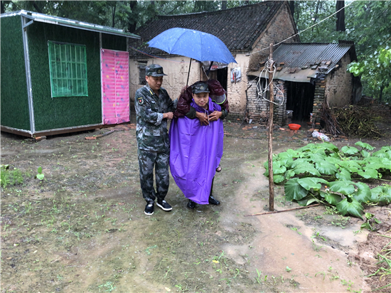 強降雨導致部分地勢較低的農(nóng)房及農(nóng)田被淹,在排查中,發(fā)現(xiàn)鄭老莊村幾處農(nóng)房被水淹泡,隨時有倒塌的危險,了解這一情況后,該鎮(zhèn)第八工作區(qū)區(qū)長、“中國好人”、優(yōu)秀退役軍人蔣昆立即組織鄭老莊村兩委人員及民兵應急隊,第一時間趕到現(xiàn)場,轉移隱患點周圍住戶?!坝暝絹碓酱?,你們這個屋今晚上不能住了,反正隨時都有倒塌的危險,把要緊的東西收拾一下,跟到我們走快點”蔣昆勸說鄭老莊村受災的一名老大爺。