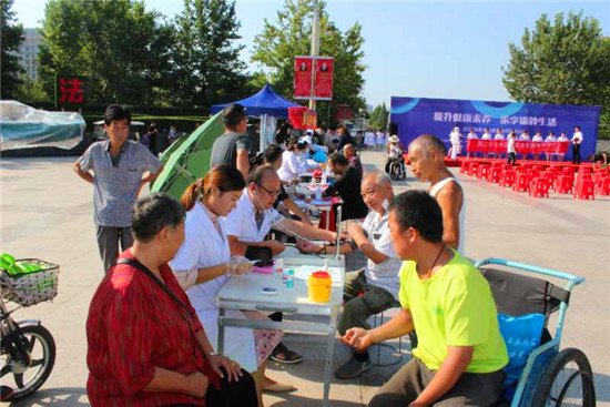 儀式現(xiàn)場(chǎng),多家單位負(fù)責(zé)人宣讀了“提升健康素養(yǎng) 樂享銀齡生活”倡議書。儀式結(jié)束后,現(xiàn)場(chǎng)舉行大型義診、健康咨詢、文藝表演等活動(dòng)。市、區(qū)醫(yī)療單位設(shè)立13個(gè)咨詢服務(wù)臺(tái),圍繞“提升健康素養(yǎng) 樂享銀齡生活”活動(dòng)主題,現(xiàn)場(chǎng)普及老年健康知識(shí),通過擺放健康知識(shí)展版、發(fā)放健康宣傳折頁、提供健康咨詢和現(xiàn)場(chǎng)義診服務(wù)等形式,為老年人提供量血壓、測(cè)血糖、測(cè)視力、等健康服務(wù)。針對(duì)常態(tài)化疫情防控中對(duì)老年人的生活照顧、健康管理、醫(yī)養(yǎng)結(jié)合、慢性病預(yù)防等內(nèi)容,結(jié)合老年人特點(diǎn),圍繞營養(yǎng)膳食、運(yùn)動(dòng)健康、心理健康、合理用藥等方面展開科普宣傳指導(dǎo),普及老年健康科學(xué)知識(shí)和老年健康相關(guān)政策。叮囑老人做好居家衛(wèi)生,出門戴口罩,做好個(gè)人防護(hù),并針對(duì)老年人常見的高血壓、糖尿病、冠心病等,給予健康評(píng)估和健康指導(dǎo),讓廣大老年人切身感受到社會(huì)的關(guān)懷和溫暖,提高了老年人的健康素養(yǎng),收到了良好的社會(huì)效果。