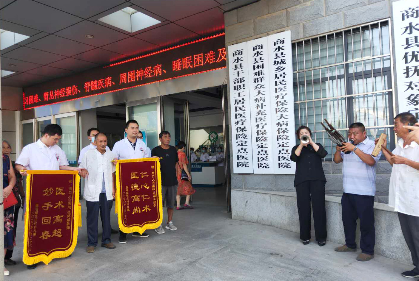 “醫(yī)術(shù)醫(yī)風(fēng)醫(yī)德好,俺給好醫(yī)生送錦旗”,歡快高昂的嗩吶聲響徹周口人合醫(yī)院急診部門前,嗩吶手以歡快的音樂(lè)表達(dá)著感激的話語(yǔ),8月27日上午10時(shí),來(lái)自商水縣固墻鎮(zhèn)張莊村的許九德老人帶著家人和一班嗩吶手,來(lái)到周口人合醫(yī)院送來(lái)錦旗,以農(nóng)民最樸實(shí)的方式表達(dá)自己的謝意。