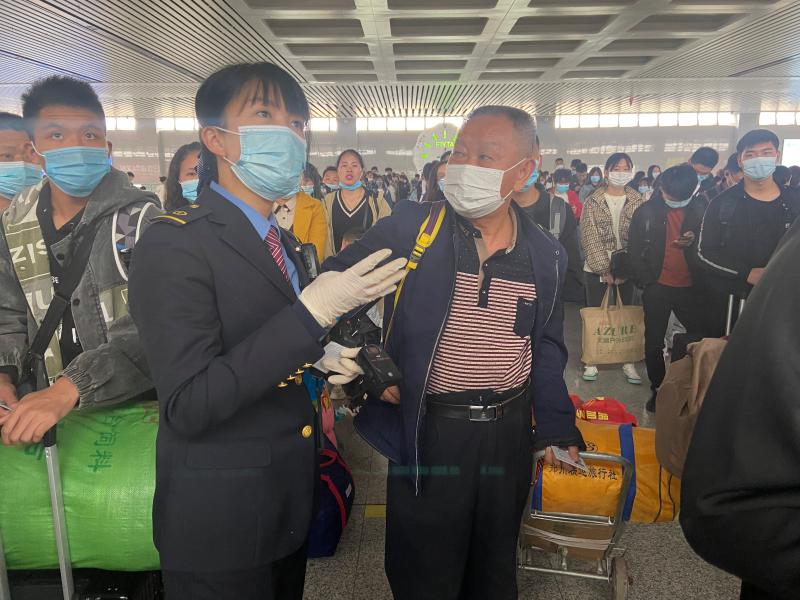 今年30多歲的王琪就是其中一名客運(yùn)值班員。她家在濮陽市,今年6月份從高鐵許昌北站調(diào)到高鐵周口東站工作,她的主要工作是在旅客進(jìn)入候車廳后,引導(dǎo)旅客有序排隊進(jìn)入站臺,調(diào)配崗位人員,遇到旅客救助等突發(fā)狀況,及時處置。