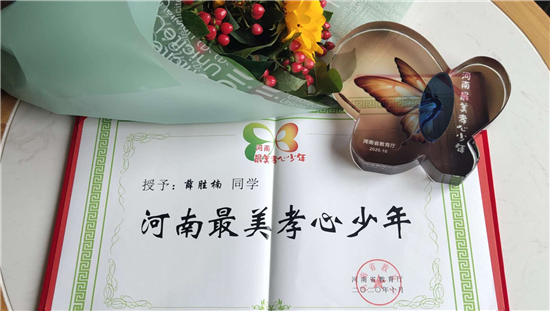 “正是天真爛漫的年紀(jì),已有歷經(jīng)歲月的坦然。在苦難中成長(zhǎng),在風(fēng)雨中自強(qiáng)。寒門(mén)至孝,貧窮遮不住你內(nèi)心的光芒。嘗罷艱辛,方能破繭成蝶、百煉成鋼。你是‘河南最美孝心少年’——薛勝楠?!边@是組委會(huì)給薛勝楠的頒獎(jiǎng)詞。