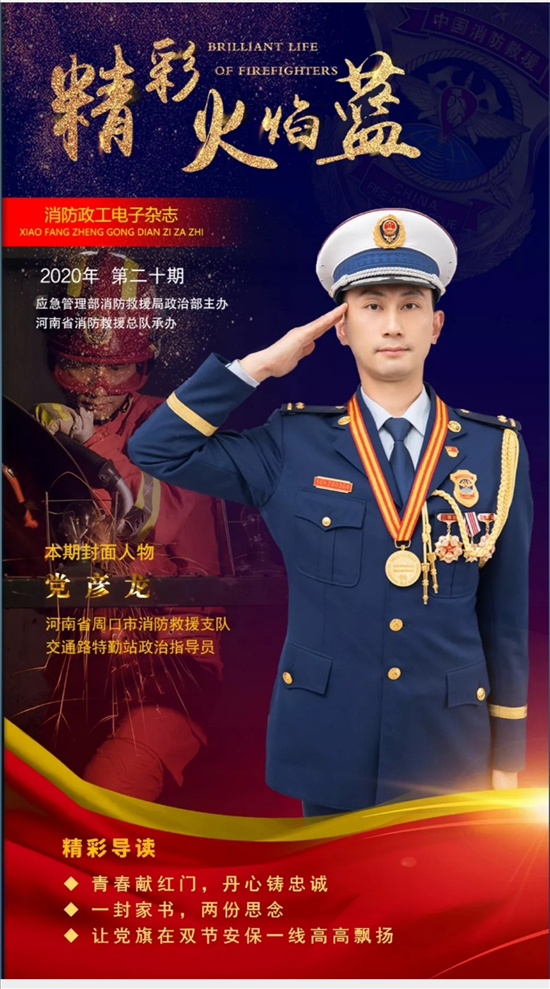 在最近一期《精彩火焰藍(lán)》電子雜志上,封面人物是來(lái)自周口消防救援支隊(duì)交通路特勤站政治指導(dǎo)員黨彥龍。該電子雜志封面人物主要介紹 “河南省最美消防人”、“河南省人民滿意的政法干警”、河南省“優(yōu)秀人民警察”等優(yōu)秀人物。
