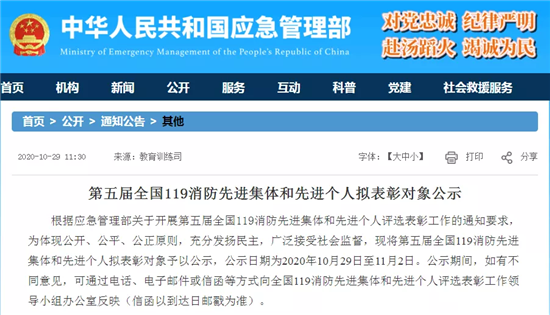 此次評選表彰工作堅持公開、公平、公正的原則,按照自下而上、逐級推薦、民主擇優(yōu)的方式進行,11月2日公示結束。據悉,這是首次將新組建的國家綜合性消防救援隊伍及其指戰(zhàn)員納入該獎項評選表彰范圍。
