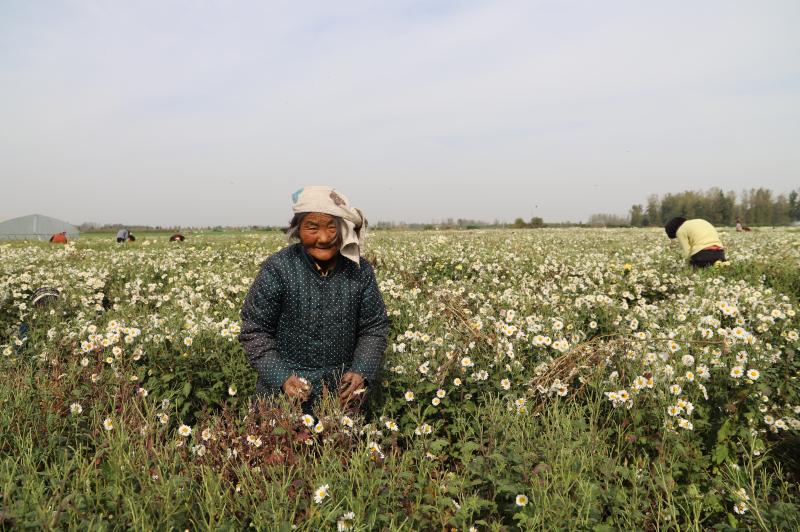 “這活兒輕,像摘棉花一樣,權(quán)當(dāng)閑著沒事兒來玩兒了。我這年齡大了,不比他們年輕人,一天才掙五六十文兒?!?6歲的脫貧致富戶晉秀云來自晉老家行政村閆莊村,和老伴陳克平相依相伴。就這樣在村里打個(gè)零工,幫助種植合作社除草、施肥、摘花、澆水,再加上黨委政府的照顧,二人順利脫貧?!瓣P(guān)鍵是干這活兒甜蜜呀,聽說這菊花賣到外地都是有錢人泡茶喝的,俺這貧困戶能嘗到第一道鮮兒。”說著,晉秀云挑一朵開得艷的菊花放進(jìn)口中,臉上露出了幸福的笑容。