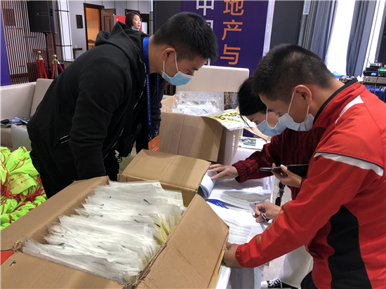 11月12日上午,記者在位于八一大道與文昌大道交叉口的佳利地產(chǎn)營銷中心門口看到,今年由于疫情管控的需要,參賽選手領(lǐng)取裝備前需要先展示自己的健康碼,并配合醫(yī)護(hù)人員測量體溫,進(jìn)入現(xiàn)場還需戴口罩。在一樓活動大廳,來自周口馬拉松協(xié)會的志愿者們先為選手確認(rèn)身份信息,再根據(jù)選手的身材、體型為其發(fā)放含有不同型號運(yùn)動衣的背包。最終,每個參賽選手都會領(lǐng)到一個熒光綠色的小背包,里面裝有號碼布、參賽長袖T恤、存衣包、手套、一次性風(fēng)雨衣和一本官方手冊等。