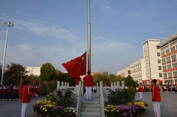 迎著朝陽,國旗護衛(wèi)隊隊員們邁著鏗鏘的步伐護衛(wèi)著國旗入場。激昂的《義勇軍進行曲》響起,全體師生莊嚴肅立,向國旗行注目禮,嘹亮的歌聲簇擁著國旗直沖云霄,在晨曦中迎風(fēng)飄揚在二實中的上空。