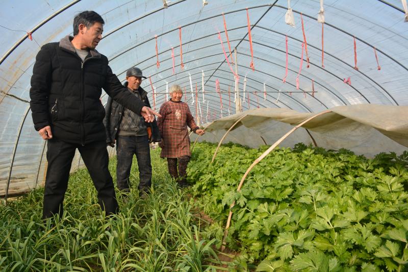 商水縣平店鄉(xiāng)葛樓村70多歲的菜農楊志新、朱妮老兩口通過“棚套棚”“ 番茄—芹菜、蒜苗—芫荽”輪作套種,每畝大棚比傳統(tǒng)種法增收5000余元。圖為1月17日,村干部深入田間走訪了解其生產銷售及惠農政策享受情況。