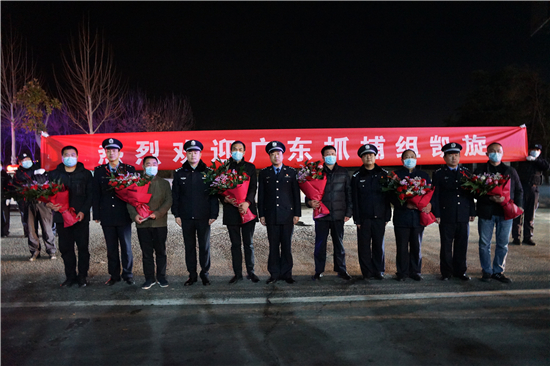 英雄凱旋,鮮花致敬。2月6日夜晚11時(shí)許,寧洛高速項(xiàng)城北收費(fèi)站警燈閃爍、隊(duì)列整齊,項(xiàng)城市公安局在這里隆重舉行儀式,熱烈歡迎 “1.8”專案組民警勝利歸來。副市長(zhǎng)、公安局長(zhǎng)萬東偉,局黨委副書記、副局長(zhǎng)陳重,局黨委委員、政辦室主任衛(wèi)偉,局黨委委員袁啟峰等領(lǐng)導(dǎo)出席儀式,部分民警代表參加了儀式。萬東偉同志代表局黨委對(duì)此案的成功偵破表示熱烈祝賀,真誠(chéng)感謝專案組民警的辛勤付出,并向大家致以崇高的敬意。
