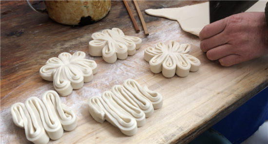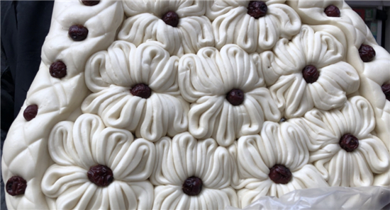 除了平常的白面饅頭,黃師傅還讓妻子現(xiàn)場展示了“棗山”制作,并介紹了棗山的寓意和習(xí)俗?!澳憧催@棗山是一層一層的,寓意著步步登高,而且棗山的花形是圓的,代表著團(tuán)團(tuán)圓圓。過去出嫁的閨女過年回娘家要帶大饃,娘家要回棗山,現(xiàn)在咱們周口的一些地方還保留著這樣的習(xí)俗?!眱晌恢鞑ンw驗(yàn)了棗山的制作過程,得到黃老板妻子的夸獎(jiǎng):“中!這倆妮兒可巧!”