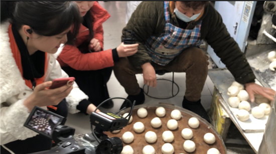 過大年,蒸饅頭。當(dāng)日9時(shí)許,在項(xiàng)城市,兩位主播唱起中國傳統(tǒng)年俗童謠,隨后走進(jìn)一家饅頭店現(xiàn)場直播年饃制作過程。饅頭店老板姓黃,從事饅頭制作30余年,直播開始即見轟鳴的和面機(jī)攪動(dòng)著巨大的白面團(tuán),黃老板介紹說,這次和的面有130余斤,”以前是人工揉面,一個(gè)壯勞力一次揉40來斤面就不錯(cuò)了?,F(xiàn)在機(jī)器揉面除了揉的多,而且快,還越揉越白,不像人工揉面越揉越黑。機(jī)器揉面越揉越勁道,做出來的饃好吃,我們這兒現(xiàn)在全機(jī)械化制作“。