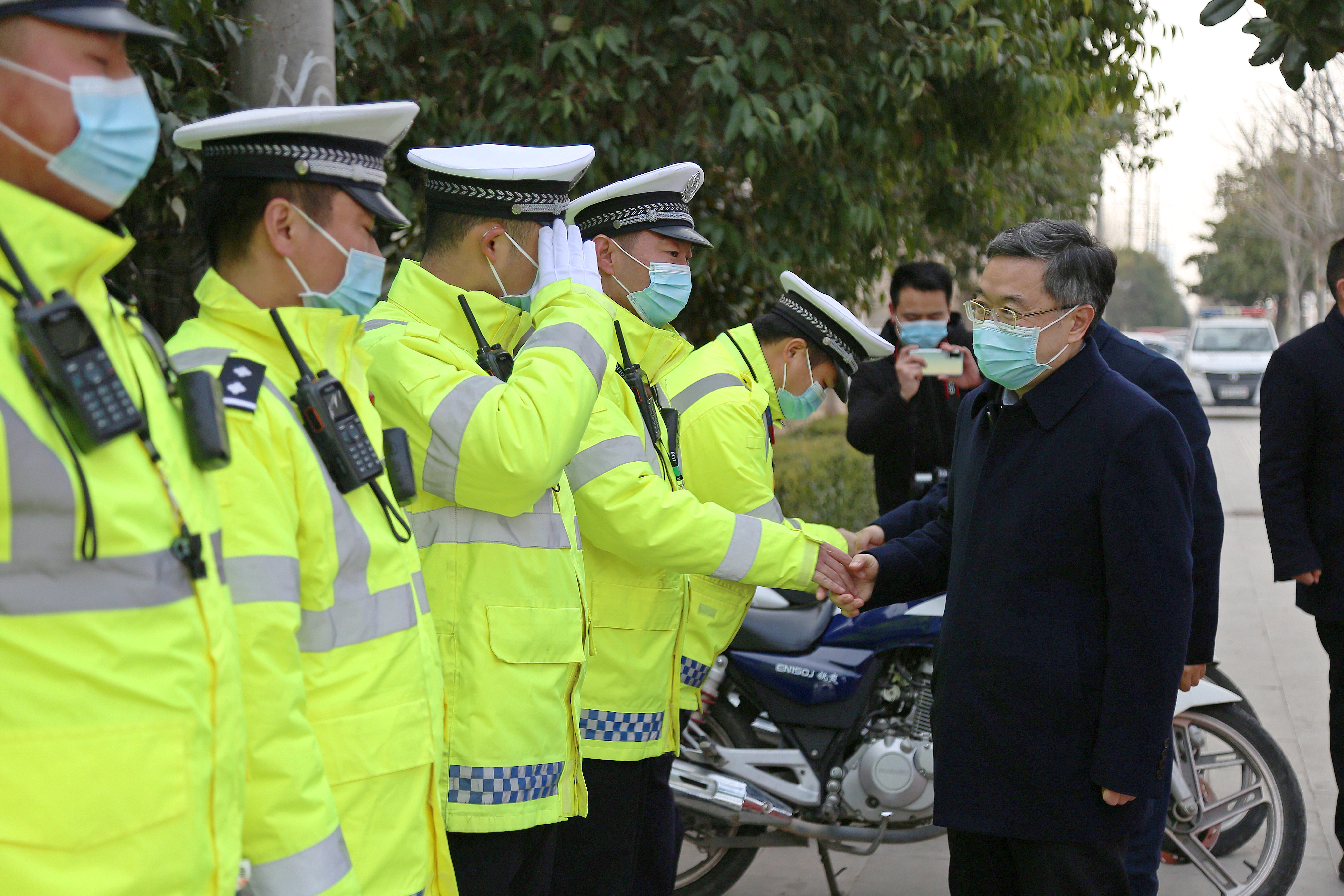 在縣交警大隊城區(qū)新區(qū)中隊五岔路口執(zhí)勤點(diǎn),皇甫立新、劉國慶同正在執(zhí)勤的交通民警一一握手,并代表縣四個班子向交警大隊全體民警、協(xié)警一年來付出的努力和辛苦表示感謝和問候,囑咐他們要注意安全,保重身體。在詳細(xì)聽取春節(jié)期間治堵保暢工作情況匯報后,皇甫立新對交警大隊全體民警和輔警在春節(jié)期間舍小家為大家,始終堅守崗位保暢通的工作態(tài)度,以及無私奉獻(xiàn)、任勞任怨的工作作風(fēng)給予高度評價。并希望大家在春節(jié)期間,繼續(xù)發(fā)揚(yáng)吃苦耐勞的精神,科學(xué)做好道路安全保障工作,克服車多人多等困難,確保春節(jié)期間全縣道路交通安全暢通,讓全縣人民愉快度過一個平安、祥和的春節(jié)。同時要求縣交警大隊要進(jìn)一步做好執(zhí)勤民警后勤保障及防寒保暖工作,加強(qiáng)人員輪換上崗,切實保障公安交警切身利益,解決他們的后顧之憂。