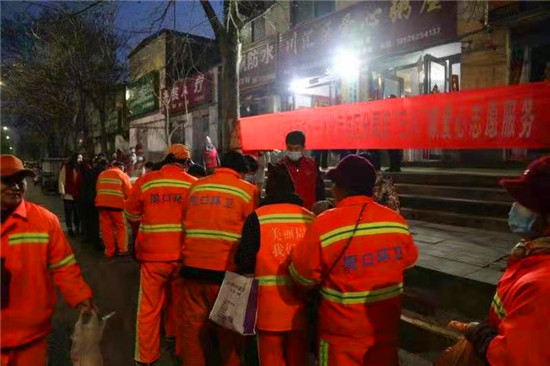當(dāng)日早上5時,在愛心粥屋里,示范區(qū)分局的志愿者們穿著紅馬甲,戴上口罩,立即進(jìn)入忙碌狀態(tài),大家既分工明確又相互配合,現(xiàn)場井然有序。他們?yōu)榄h(huán)衛(wèi)工人盛飯端菜,拿雞蛋饅頭,動作迅速,熱情周到,有條不紊,個個忙得不亦樂乎。在這個清冷的早晨,因?yàn)橛辛藷釟怛v騰的飯菜和志愿者忙碌的身影,環(huán)衛(wèi)工人開心地笑容,感受到濃濃暖意。