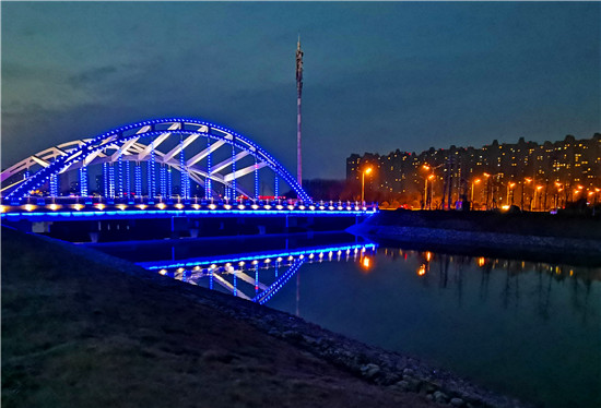 夜幕降臨時(shí),流沙河泰山路橋溫馨的燈光亮了起來,夢幻藍(lán)、蘋果綠、水晶紫、多種顏色變換的橋體顯得熠熠生輝 ,多彩的橋在水面的映襯下流光溢彩。