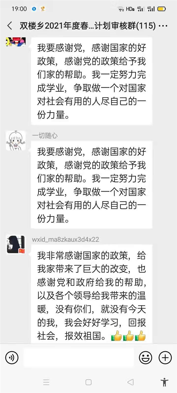 “感謝幫助過我家的所有幫扶人,沒有你們,就沒有我家今天的幸福生活,我們光榮脫貧了,作為貧困家庭中新成長勞動力,我一定珍惜這次來之不易的學(xué)習(xí)機(jī)會,好好學(xué)習(xí)技術(shù),畢業(yè)后回村成為一名技術(shù)帶頭人,來促進(jìn)家鄉(xiāng)產(chǎn)業(yè)的發(fā)展?!编惓强h雙樓鄉(xiāng)孫莊村脫貧學(xué)生張素華在微信群里說。近幾天,鄲城縣雙樓鄉(xiāng)114人的大學(xué)生微信群里可熱鬧了,在鄉(xiāng)黨委政府的引導(dǎo)下,該鄉(xiāng)眾多脫貧后的大學(xué)生通過鄉(xiāng)里建起的微信群,紛紛圍繞“話脫貧、感黨恩、奮進(jìn)新時代”這一主題交流思想,提振斗志。