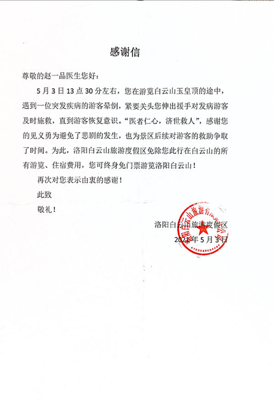 得知趙醫(yī)生見(jiàn)義勇為的事跡后,洛陽(yáng)白云山旅游度假區(qū)對(duì)趙一品醫(yī)生送出了感謝信,免除他此行在白云山的所有游覽、住宿費(fèi)用,并可終身免門票游覽洛陽(yáng)白云山。