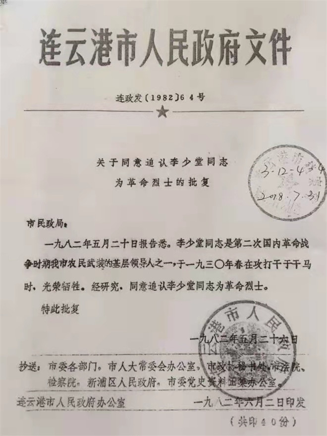 新中國成立后,李少堂的孫子才聯(lián)系上了李少堂曾經的革命戰(zhàn)友惠浴宇同志。時任江蘇省省長的惠浴宇同志得知消息后,親寫證明遞交黨中央,這才證實了李少堂的身份。