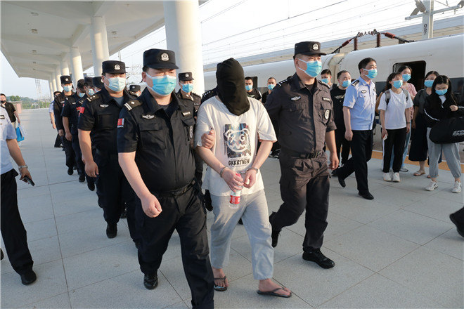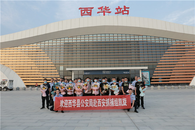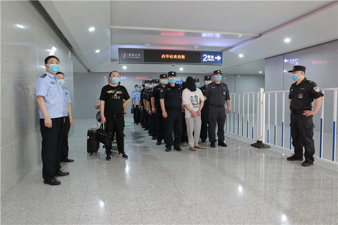 當(dāng)天,西華縣公安局在鄭阜高鐵西華站舉行歡迎儀式,迎接赴西安抓捕組凱旋歸來(lái)。特警在站臺(tái)上排列整齊、嚴(yán)陣以待,列車準(zhǔn)時(shí)??康秸?,7名犯罪嫌疑人隨即被押解下車,全副武裝的特警立即上前進(jìn)行押解交接,押往在高鐵出站口等候的裝甲車上。至此,歷經(jīng)三天三夜,一起電信網(wǎng)絡(luò)詐騙團(tuán)伙案成功告破。