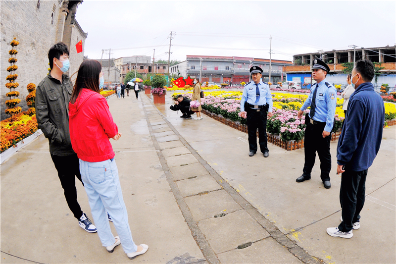 國慶七天長假,商水縣公安局在致力文旅創(chuàng)意的葉氏莊園、水韻章華等景區(qū)內(nèi)加強巡邏執(zhí)勤,維護景區(qū)的安全穩(wěn)定,為來自全國各地的游客提供服務(wù)。圖為10月7日,商水縣公安局鄧城派出所民警在有“中原小故宮”之稱的葉氏莊園景區(qū)菊展現(xiàn)場巡邏執(zhí)勤、服務(wù)游客。