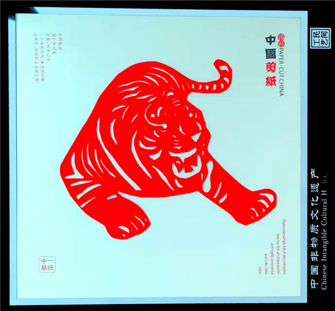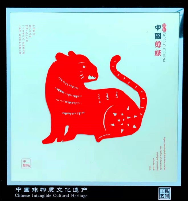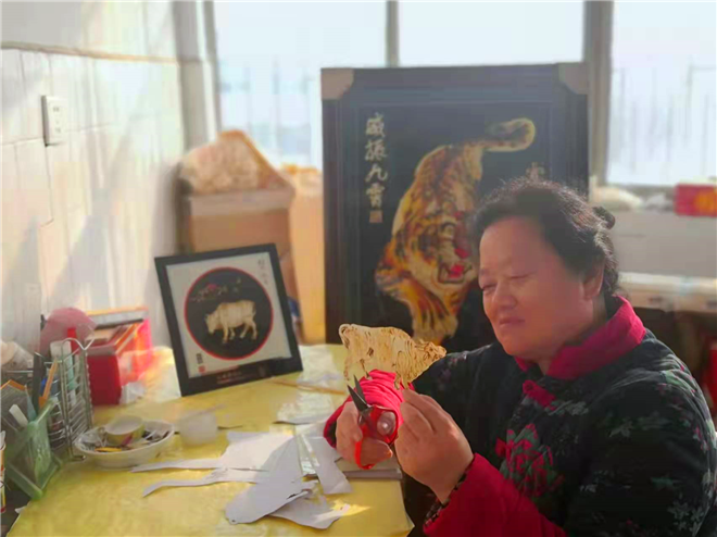 為了慶祝虎年,王春梅創(chuàng)作的秸稈畫主要有《威震九霄》《虎之王者》《飛天神虎》等,此外,她還創(chuàng)作了兩幅剪紙作品,分別是《虎年組圖》和《虎之2022》。和剪紙作品相比,秸稈畫制作工序更加復(fù)雜,全憑手工完成,充分利用秸稈本身的紋理和質(zhì)地,結(jié)合顏色、溫度的變化,將畫面立體的呈現(xiàn)出來。其中,她創(chuàng)作的部分作品結(jié)合了唐卡的相關(guān)風(fēng)格和顏色配比,比如《威震九霄》中虎的形象所表現(xiàn)出來的力量感借鑒了唐卡中護(hù)法的力量感;《虎之王者》和《虎之2022》中對于藍(lán)色的運(yùn)用結(jié)合了唐卡中的藍(lán)色,代表了永恒不變,如同穹蒼攬護(hù)萬物之意。