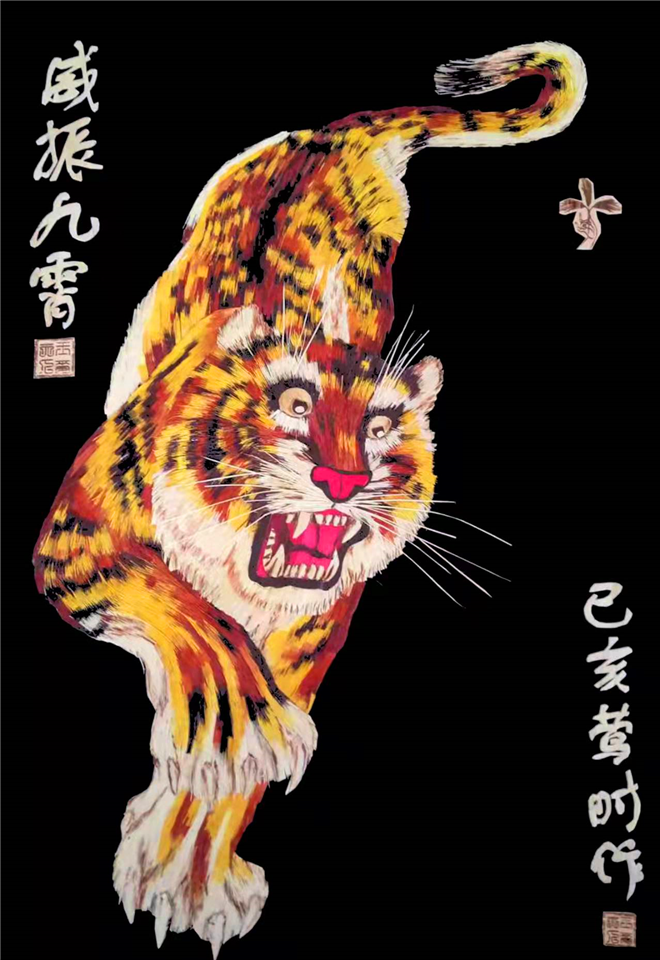 “虎在中國是極其有力量的動(dòng)物?!?月25日,秸稈畫技藝代表性傳承人、中國民間文藝家協(xié)會國家級會員王春梅告訴記者,她耗時(shí)近半年創(chuàng)作的秸稈畫《威震九霄》已完成。記者看到,作品中的老虎長半米有余,威風(fēng)凜凜、活靈活現(xiàn),用平面的方式展現(xiàn)了立體的效果?!?022年是虎年。在古代,老虎就以威風(fēng)凜凜的形象被視為勇氣的象征,來表現(xiàn)軍人的勇敢和堅(jiān)強(qiáng)。古時(shí)候關(guān)于將士大臣的美譽(yù)就有虎將、虎臣、虎士等?!蓖醮好氛f。