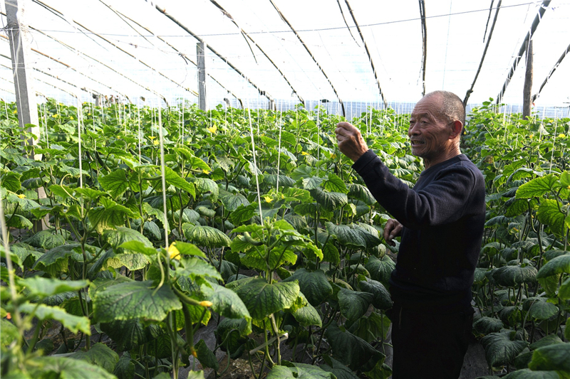 扶溝縣柴崗鄉(xiāng)梅橋村是遠(yuǎn)近聞名的黃瓜種植專業(yè)村,全村1200畝土地上建有1100畝蔬菜大棚,最多的一戶村民有大棚10多個(gè),畝均效益5萬(wàn)多元,黃瓜種植成為當(dāng)?shù)剜l(xiāng)村振興的好產(chǎn)業(yè)。圖為昨日70多歲的脫貧戶梅鐵棍在幫助兒子管理黃瓜。