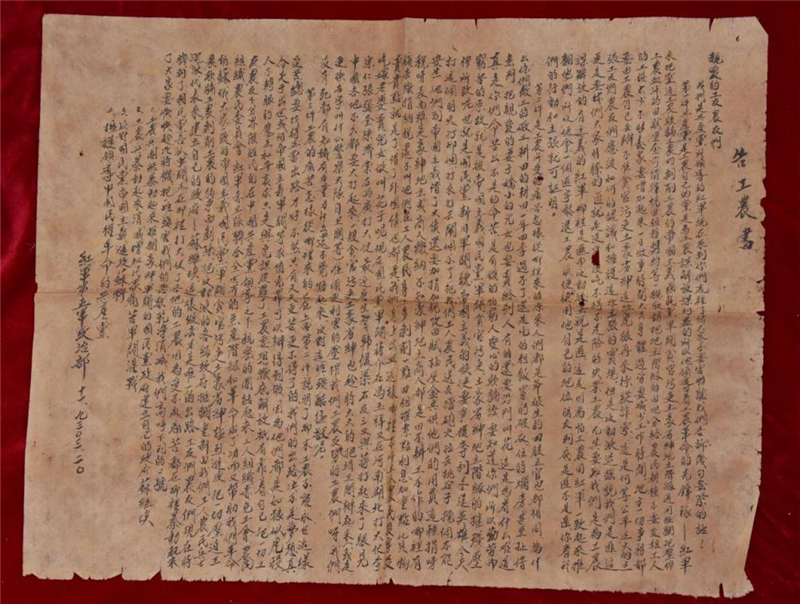 1928年7月22日,彭德懷領導湘軍獨立第五師第一團等部于湖南省平江城起義。不久,部隊即奉命改編為中國工農紅軍第五軍第十三師。1930年6月,紅五軍在湖北省大冶縣編入紅三軍團。根據《紅軍第五軍政治部告工農書》的落款時間及內容可以看出,此布告落款時間為1930年3月20日,它是研究紅五軍開展農民工作、宣傳工作和紅五軍光輝歷史的重要史料佐證。