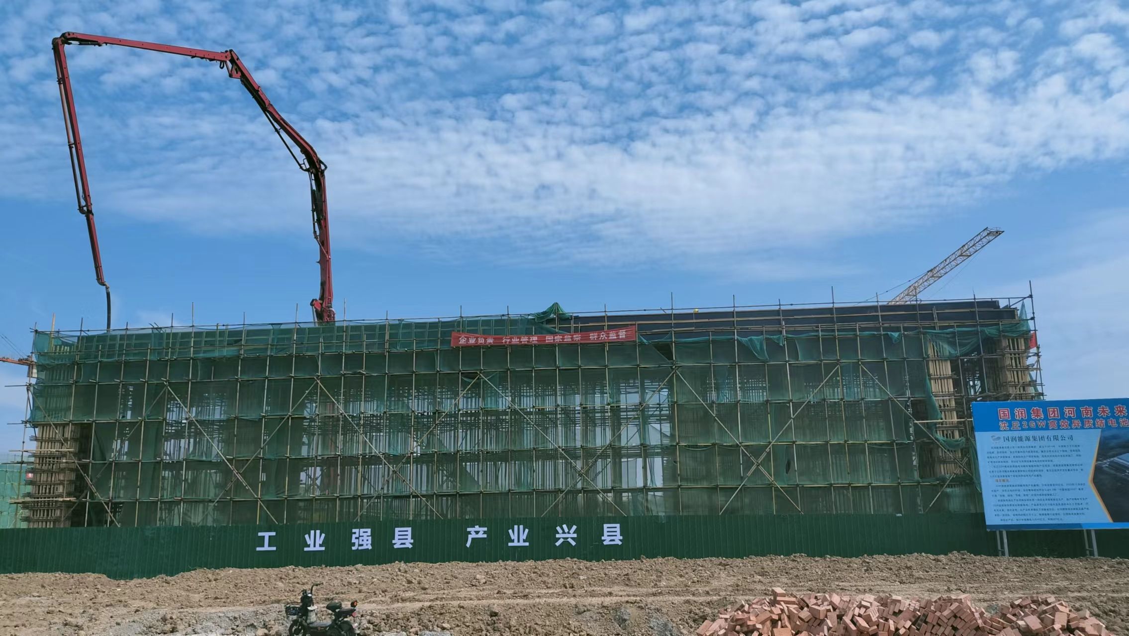 離開標(biāo)準(zhǔn)化廠房建設(shè)工地,記者又來到位于沈丘縣現(xiàn)代科技產(chǎn)業(yè)園內(nèi)的河南未來新能源沈丘2GW高效異質(zhì)結(jié)(HJT)電池綠色智能制造項目工地,那里也是塔吊林立,一片繁忙景象。高端電池生產(chǎn)車間正在緊張施工中,一臺灌漿機正在澆筑房頂。項目部負責(zé)人張旭輝說:“正在建設(shè)的是高端太陽能芯片生產(chǎn)車間主廠房面積2.41萬平方米,鋼架5200平方米,10月底完工,11月份安裝設(shè)備?!?/p>