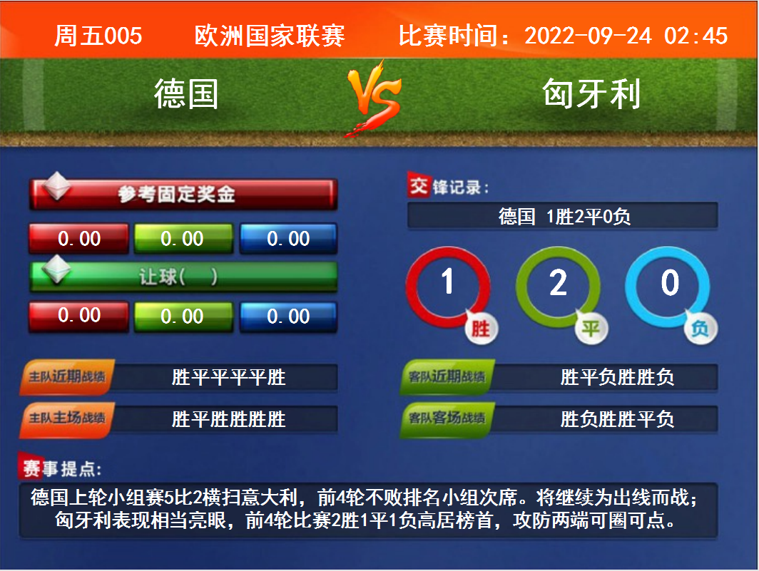 比賽時間:2022-09-24 02:45賽事提點(diǎn):德國上輪小組賽5比2橫掃意大利,前4輪不敗排名小組次席。將繼續(xù)為出線而戰(zhàn);匈牙利表現(xiàn)相當(dāng)亮眼,前4輪比賽2勝1平1負(fù)高居榜首,攻防兩端可圈可點(diǎn)。