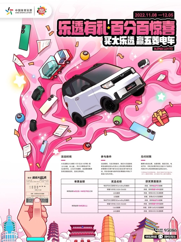 巡游期間,河南體彩大樂透的購彩抽獎活動也將同步開啟,大樂透第22128期(11月7日20:10開售)-第22139期,共12期,期期均有大禮派送,頭獎可獲得五菱mini GameBoy玩咖版一輛!