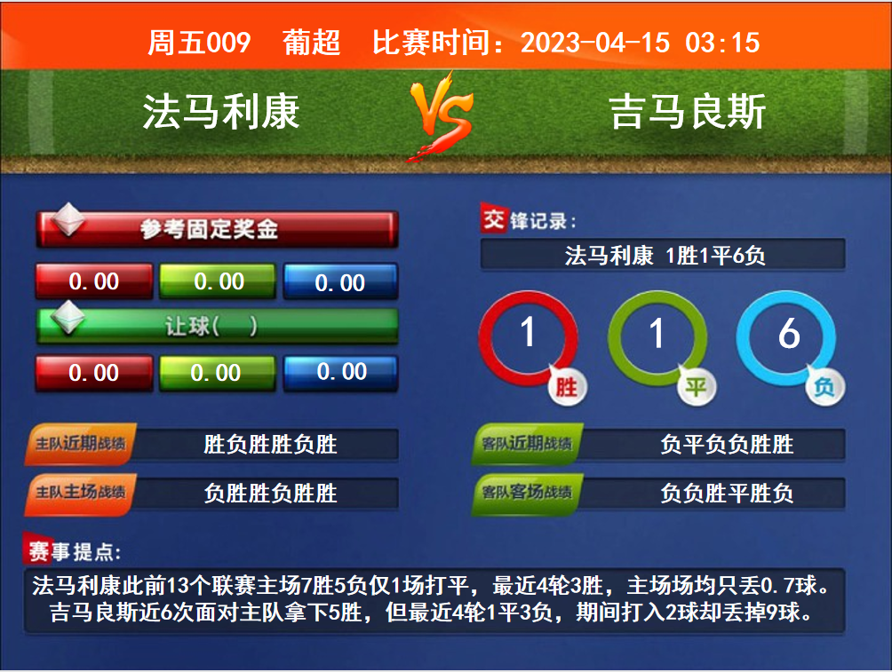比賽時間:2023-04-15 03:15賽事提點(diǎn):法馬利康此前13個聯(lián)賽主場7勝5負(fù)僅1場打平,最近4輪3勝,主場場均只丟0.7球。吉馬良斯近6次面對主隊(duì)拿下5勝,但最近4輪1平3負(fù),期間打入2球卻丟掉9球。