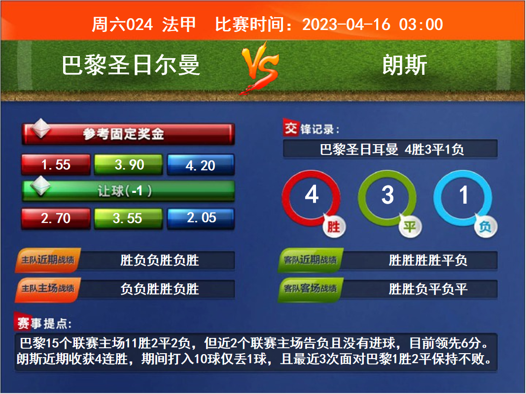 比賽時間:2023-04-16 03:00賽事提點:巴黎15個聯(lián)賽主場11勝2平2負,但近2個聯(lián)賽主場告負且沒有進球,目前領(lǐng)先6分。朗斯近期收獲4連勝,期間打入10球僅丟1球,且最近3次面對巴黎1勝2平保持不敗。