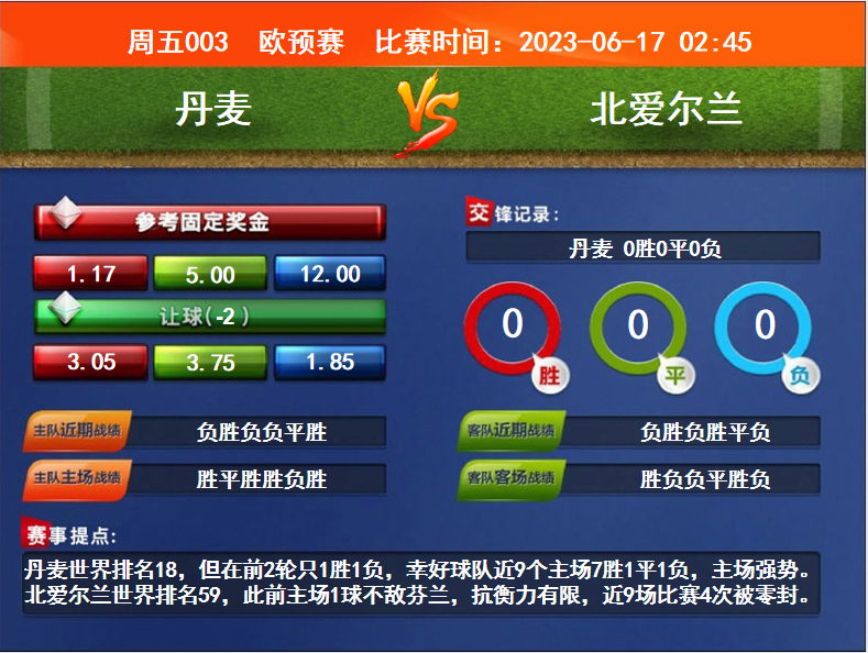 比賽時間:2023-06-17 02:45賽事提點:丹麥世界排名18,但在前2輪只1勝1負,幸好球隊近9個主場7勝1平1負,主場強勢。北愛爾蘭世界排名59,此前主場1球不敵芬蘭,抗衡力有限,近9場比賽4次被零封。