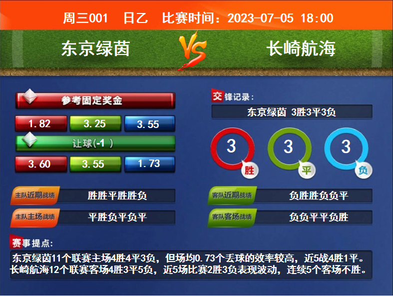 比賽時間:2023-07-05 18:00賽事提點:東京綠茵11個聯(lián)賽主場4勝4平3負,但場均0.73個丟球的效率較高,近5戰(zhàn)4勝1平。長崎航海12個聯(lián)賽客場4勝3平5負,近5場比賽2勝3負表現(xiàn)波動,連續(xù)5個客場不勝。