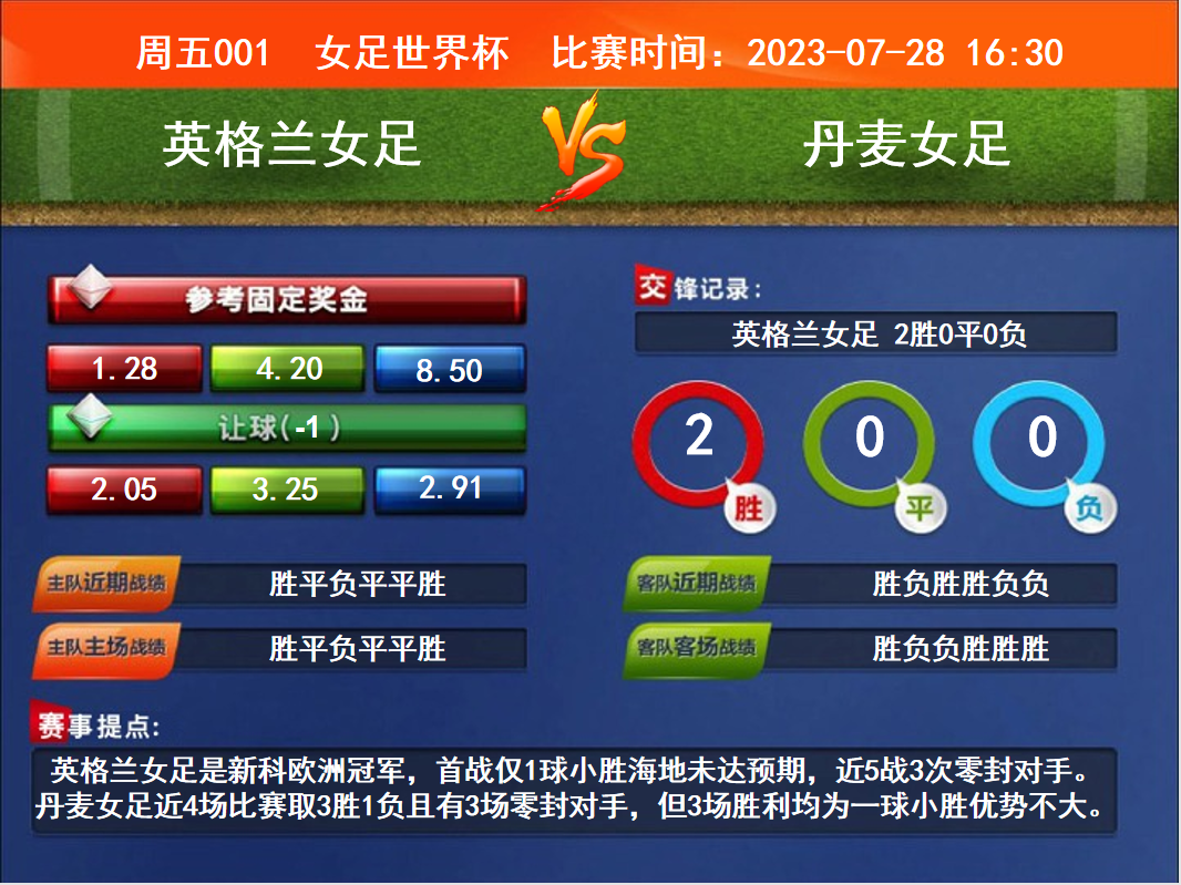比賽時(shí)間:2023-07-28 16:30賽事提點(diǎn):英格蘭女足是新科歐洲冠軍,首戰(zhàn)僅1球小勝海地未達(dá)預(yù)期,近5戰(zhàn)3次零封對手。丹麥女足近4場比賽取3勝1負(fù)且有3場零封對手,但3場勝利均為一球小勝優(yōu)勢不大。