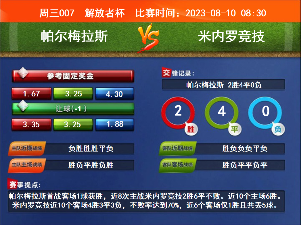 比賽時間:2023-08-10 08:30賽事提點:帕爾梅拉斯首戰(zhàn)客場1球獲勝,近8次主戰(zhàn)米內(nèi)羅競技2勝6平不敗。近10個主場6勝。米內(nèi)羅競技近10個客場4勝3平3負,不敗率達到70%,近6個客場僅1勝且共丟5球。