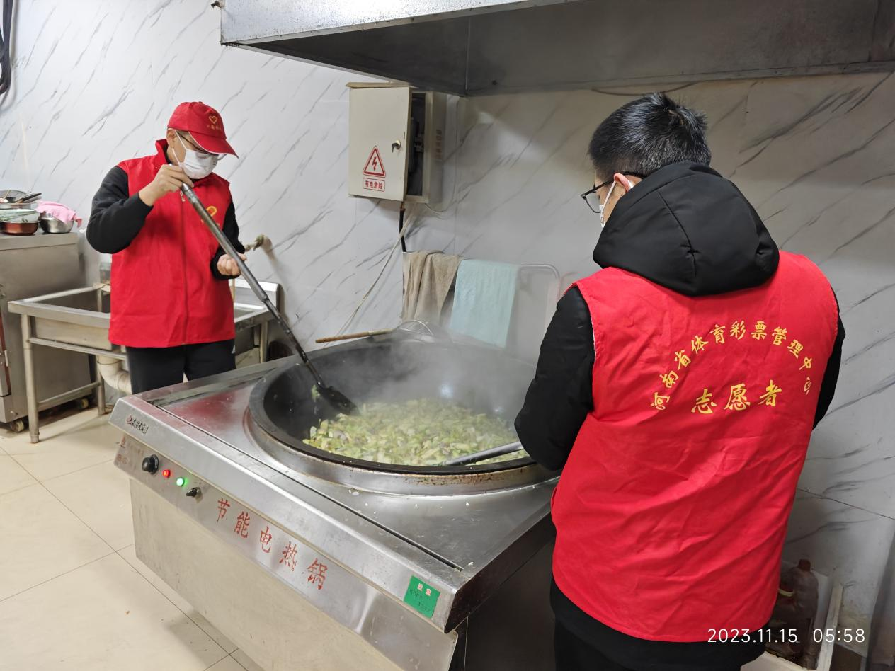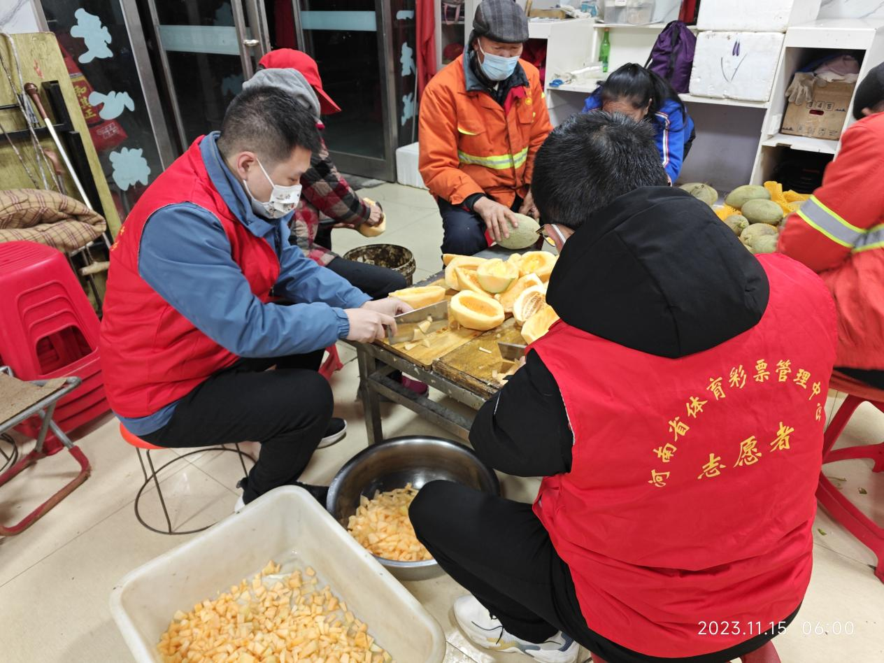 11月16日凌晨5時,周口體彩分中心志愿者還到“東方愛心粥屋”開展志愿服務活動,幫助粥屋工作人員洗菜、切菜、炒菜、熬粥。
