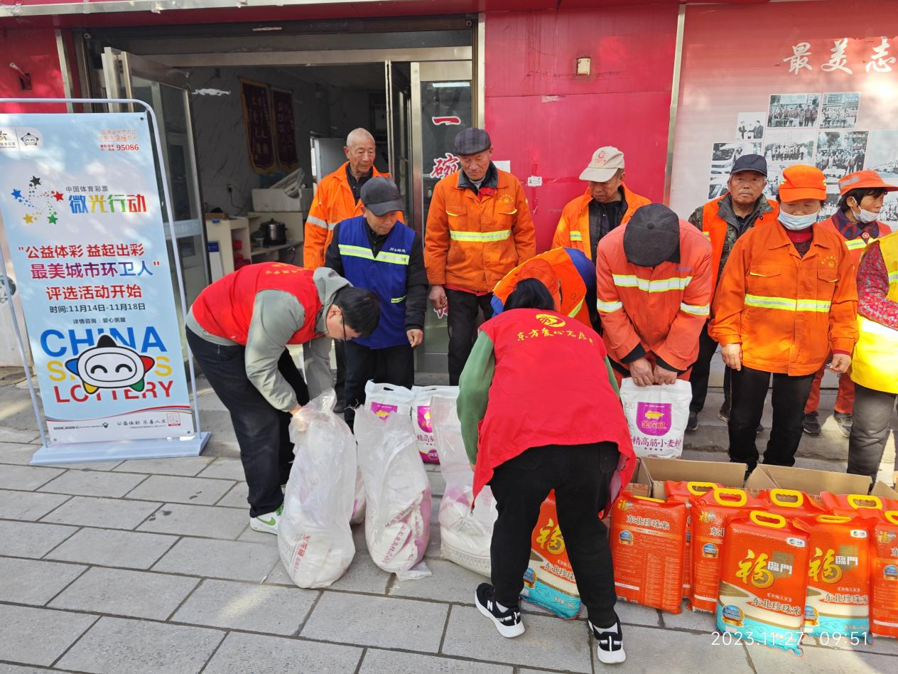 11月27日,周口體彩分中心工作人員攜帶米、面等物資來到“東方愛心粥屋”開展“公益體彩 益起出彩”致敬“城市最美環(huán)衛(wèi)人”活動(dòng)公益活動(dòng),對20名“城市最美環(huán)衛(wèi)人”開展捐助。