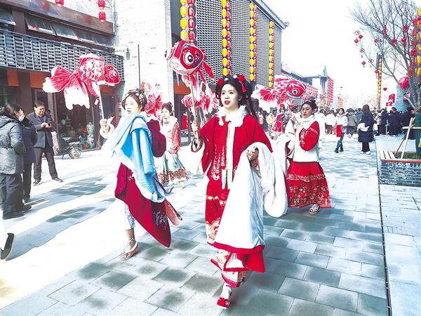 翠袖紅裙、直襟長袍……身著漢服的演員,手持魚燈,巡游關(guān)帝老街,伴隨著樂曲翩翩起舞,成為一道靚麗的風(fēng)景線。