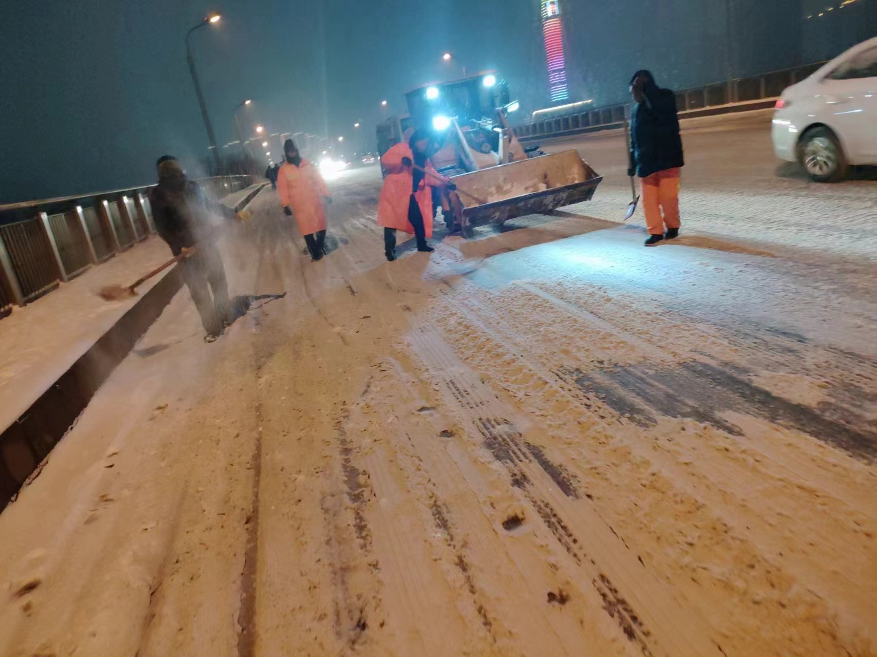 2月2日下午,為降低夜間低溫可能造成的路面結(jié)冰影響,市城管局組織人員加強(qiáng)對(duì)城區(qū)主要道路、橋梁等重點(diǎn)區(qū)域巡查,及時(shí)了解收集易結(jié)冰路段情況,各區(qū)城管組織人員車輛分班作業(yè),采取人車齊上陣,晝夜不停清理道路積雪。同時(shí)組織人工保潔力量,分布在城區(qū)各條道路上,分工協(xié)作,有條不紊,撒布融雪劑,為群眾出行安全保駕護(hù)航。