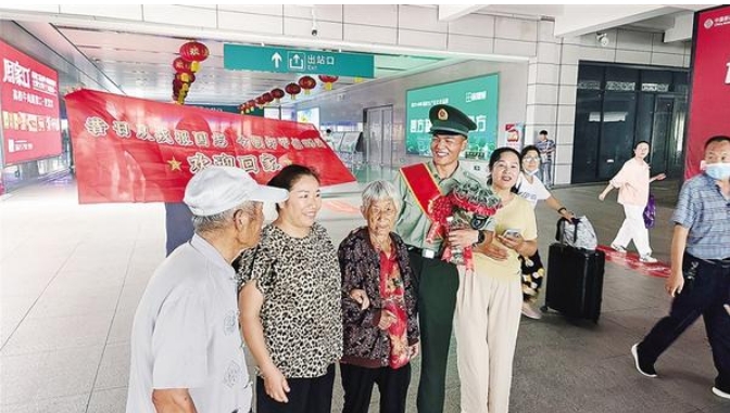 9月4日,在高鐵周口東站出站口,市民們早早守候,手拉橫幅,眼里閃著期待的淚光,迎接從部隊(duì)退役的親人。橫幅上的每一個(gè)字,都是家人最深沉的愛與最由衷的敬佩:“昔日從戎報(bào)國志,今朝卸甲創(chuàng)輝煌?!?/p>