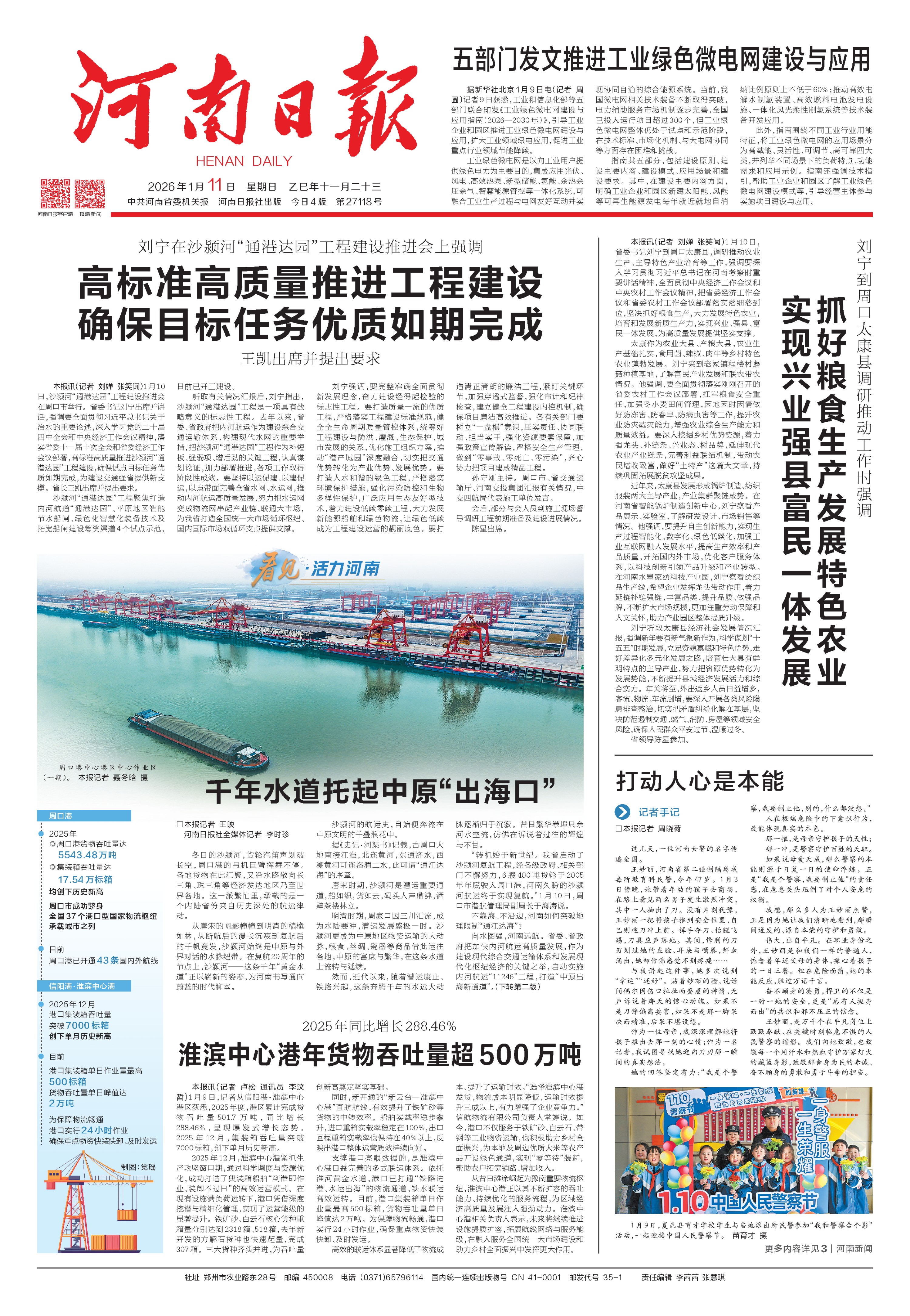 漯河港、平頂山港相繼開港運(yùn)營(yíng);周口港中心港區(qū)中心作業(yè)區(qū)一期工程去年年底建成投用,標(biāo)志著河南內(nèi)河集裝箱運(yùn)輸邁入“百萬標(biāo)箱時(shí)代”;沙潁河“通港達(dá)園”工程開工建設(shè),進(jìn)一步完善我省水運(yùn)網(wǎng)絡(luò),服務(wù)和融入新發(fā)展格局。