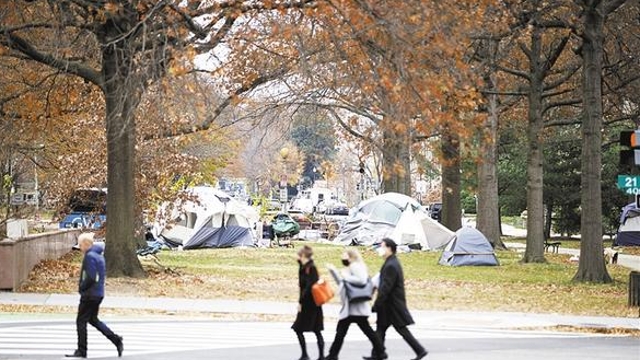 12月8日,在美國華盛頓,行人經(jīng)過無家可歸者居住的帳篷?!?a href="http://m.nysmokeshops.com/content/2021-12/11/content_962080.html" target="_blank" >[詳細(xì)]